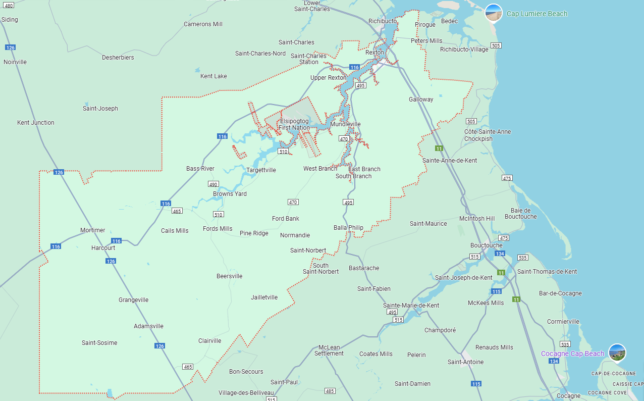 The new municipality was comprised of the former village of Rexton, the former Local Service District of Weldford, and parts of the Local Service Districts of Harcourt and Richibucto Parish.